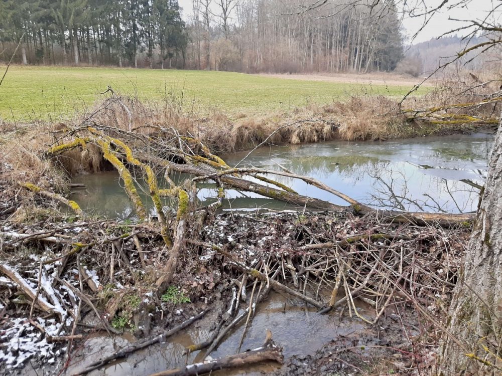 Wir gehen noch gut 100 m auf der Straße hinunter ins Landschaftsschutzgebiet (LSG) Mühlbachtal, wo der Heudorfer Bach fließt. Wir folgen vor dem Bachlauf dem Fahrweg nun nach rechts bergauf vorbei an einem markanten Biberrevier. Hier erkennt man sehr deutlich, wie der Biber die Landschaft gestaltet, auch wenn der Mensch aus Sicherheitsgründen eingreifen musste.
