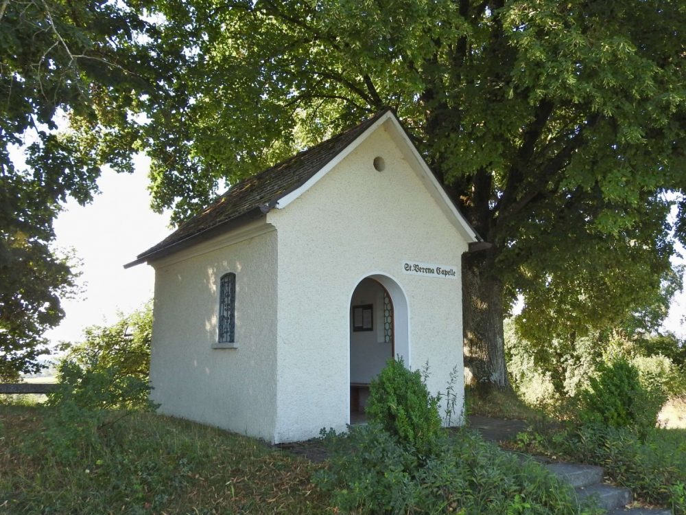 Ca. 800 m nach Ortsausgang gehen wir relativ nah an die Donau heran. Hier befindet sich das Naturschutzgebiet (NSG) Blochinger Sandwinkel. An diesem kommen wir am anderen Donauufer noch einmal zum Ende der Tour vorbei, wo wir es dann auch besser einsehen können. Jetzt folgen wir dem Hauptweg zweimal nach links (wobei wir den mit blauer Raute gekennzeichneten Weg verlassen) und gehen aufwärts bis zur St. Verena-Kapelle an der K8262.