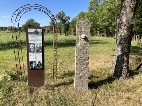 Anschließend weiter auf dem gekennzeichneten Limeswanderweg durch alten Eichenmischwald zum Gleichener See. Der Wegverlauf folgt weiterhin dem Limeswanderweg, zuerst in Richtung Frohnfalls und dann rechts hinauf auf die Ebene bis kurz vor den Weiler Neuwirtshaus. Der weitere Weg verläuft über den Neuwirtssee zur Gedenkstätte an die Widerstandskämpfer Sophie und Hans Scholl nordöstlich des Weilers Steinbrück.