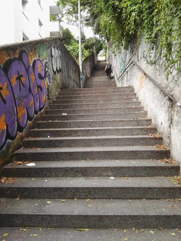 Vom Marienplatz fährt man die Zacke hinauf bis zur Haltestelle „Haigst“. Wer möchte, kann noch einen Abstecher, zum Santiago-de-Chile-Platz machen, der auf der anderen Straßenseite der Station liegt und genießt die Ausblicke auf die Stuttgarter Innenstadt (Bild 6/7). Ein kleines Stück folgt der Wanderweg den Gleisen hinauf und biegt dann nach rechts in die „Fidellostraße“ ein. Immer geradeaus auch über einen Fußweg wird schließlich die „Leonorenstraße“ erreicht. Dieser folgt man nach links bis nach 150 Metern ein schöner Aussichtspunkt zum Verweilen einlädt (Bild 8). 200 Meter weiter erreicht man dann den Waldrand. Dort geht es auf einem Schotterweg, dem Dornhaldenweg (Bild 9), durch den Wald bis zum Garnisonsschützenhaus und weiter zum Dornhaldenfriedhof. Die Besonderheit dieses Friedhofs liegt darin, dass dieser sich auf dem Gelände des ehemaligen Schießplatzes Dornhalde der Königlichen Garnison Stuttgart befindet. Von dort geht es weiter hinab zur „Heinestraße“, diese wird überquert und man folgt der „Eugen-Dolmetsch-Straße“ weiter bis zum Waldfriedhof. Ein Stück unterhalb befindet sich die Seilbahn (Bild 10). Diese fährt den Wanderer bis zum Startpunkt der Tour am Südheimer Platz.
