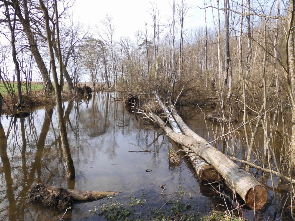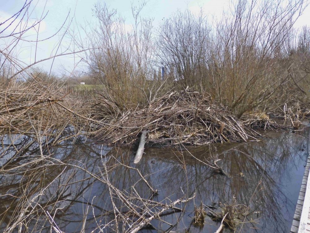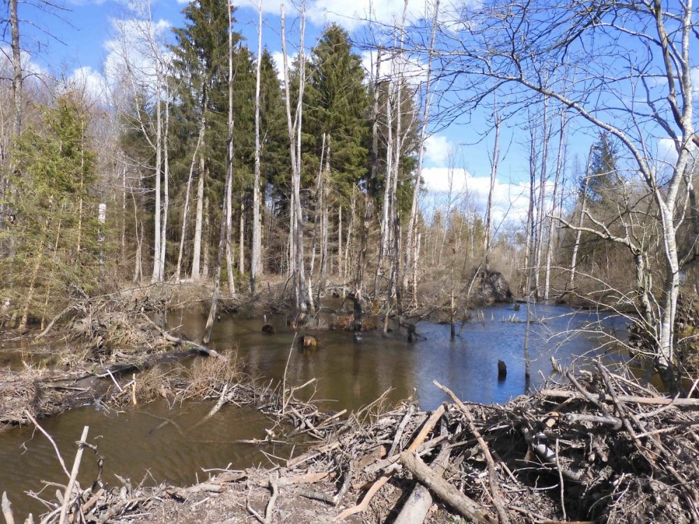 Die weitere Tour führt aber vor dem Damm gut 100 m auf dem Teersträßle entlang, bevor man nach rechts auf ein weiteres Sträßlein einbiegt, das wochenends für Kraftfahrzeuge gesperrt ist. Dieses geht man 200 m aufwärts. In der Linkskurve biegt man scharf links auf einen Waldweg ein, an dessen Ende (nach knapp 500 m) man im Bereich von gut 200 m viermal abbiegen muss (links – rechts – links – rechts). Am Ende des folgenden geraden fast 500 m langen Abschnittes muss man noch kurz nach links ausweichen (nicht der Beschilderung folgen). Man gelangt an eine neu gestaltete Naturlandschaft, an dessen Formung der Biber nicht ganz unbeteiligt war.